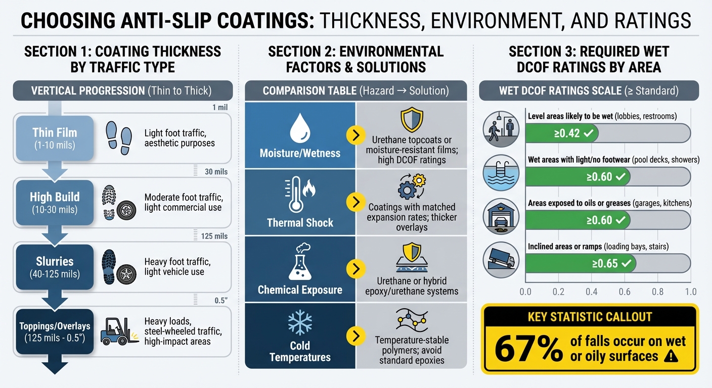 For areas dealing with heavy loads and frequent impacts, thicker systems (125 mils to 0.5 inches) are necessary, while lighter traffic may only need thin films (1–10 mils). It’s worth noting that about 67% of falls occur on wet or oily surfaces, often during the heel strike phase of walking.